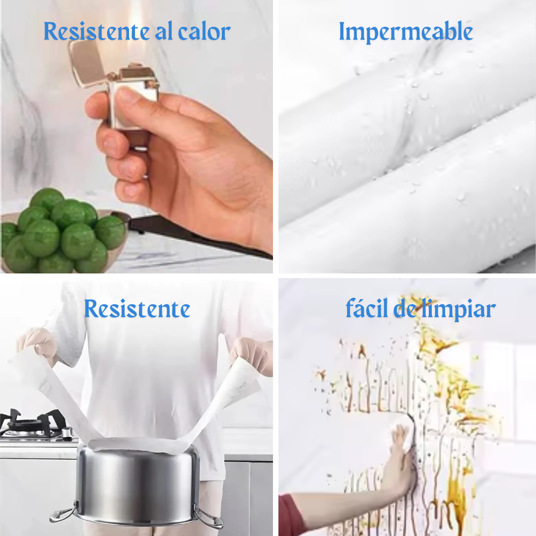 Es un vinil adhesivo fabricado con materiales de alta calidad que imitan el diseño del mármol real. Su tecnología autoadhesiva garantiza una instalación sencilla y una adherencia firme en cualquier superficie lisa, mientras que su capa impermeable protege contra manchas, humedad y desgaste.