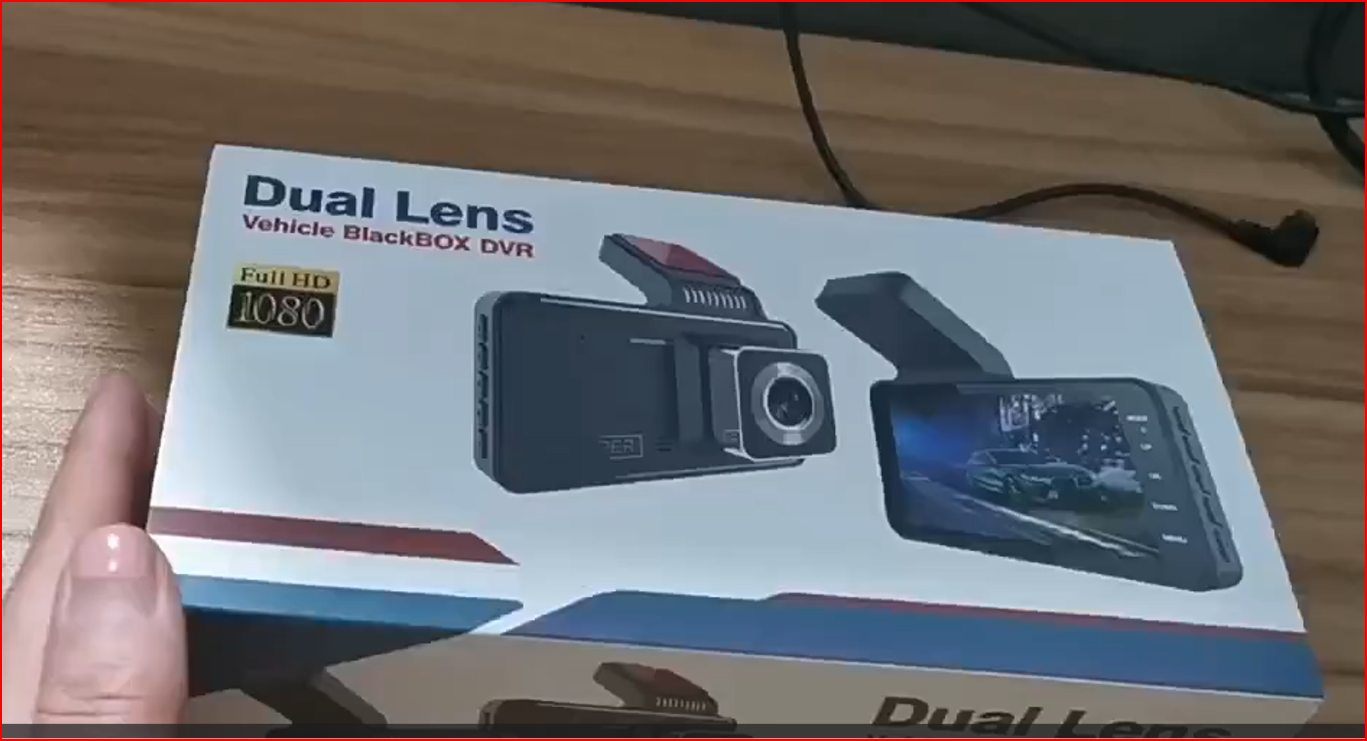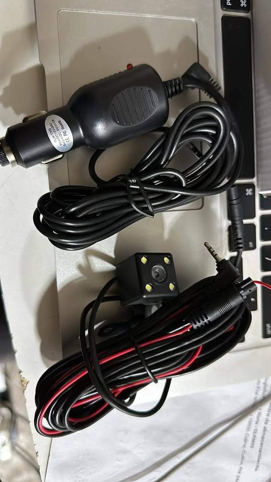 El paquete incluye una cámara frontal, una cámara trasera, cables de conexión, un cargador para auto y un manual de usuario.